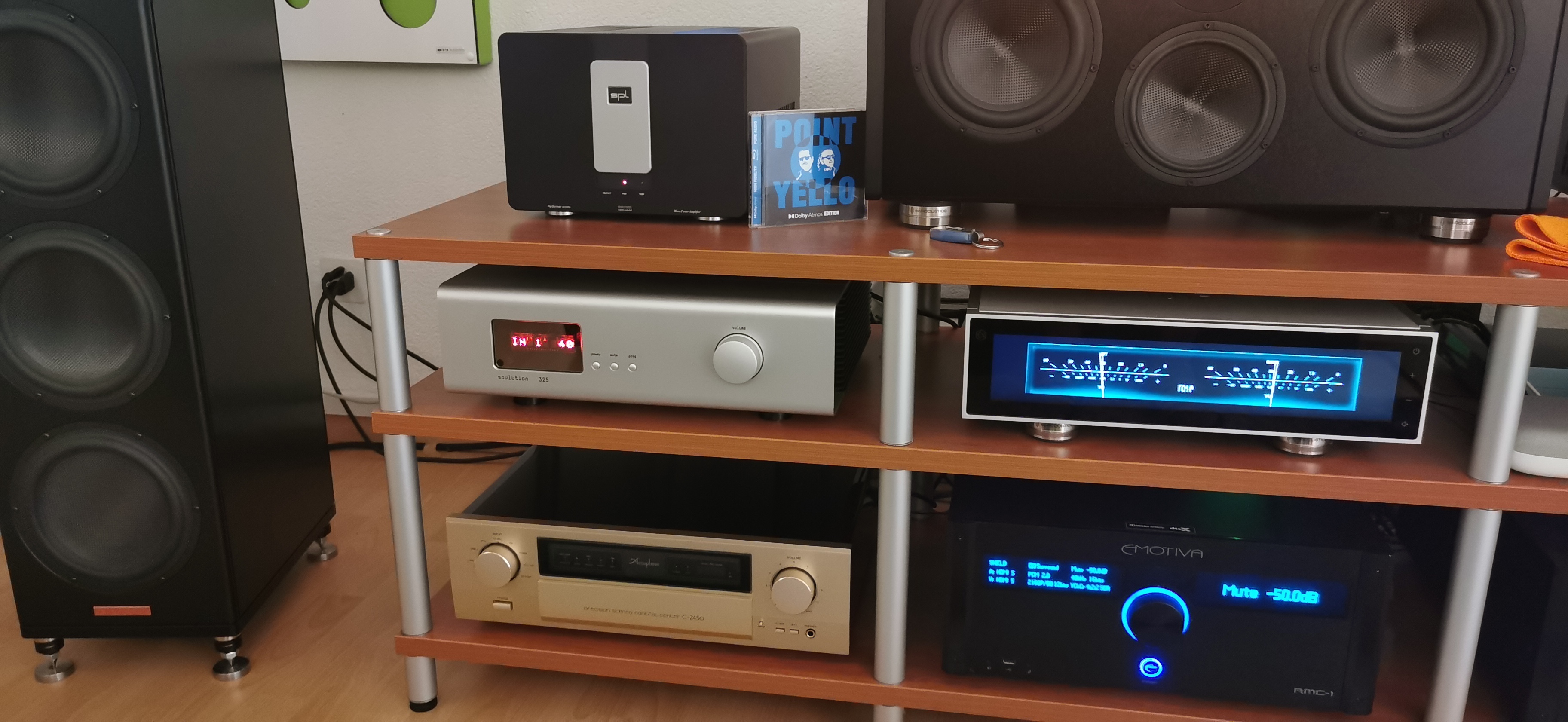 Als erster Kandidat ist die 2450 bei mir eingetroffen, und wurde natürlich sofort in die Anlage integriert. Rose RS150 als Netzwerk Streamer, mit XLR out auf Balanced IN bei der 2450. L/R OUT von der Emotiva RMC-1 auf EXT PRE IN (Balanced).